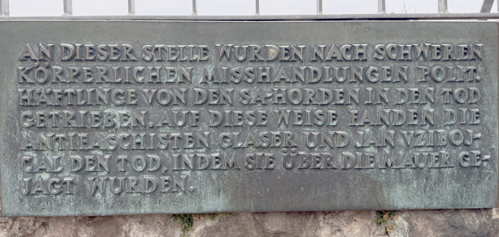 Diese Tafel ist aktuell noch auf der Burg zu finden und kennzeichnet den Ort, an dem Häftlinge in den Tod getrieben wurden.